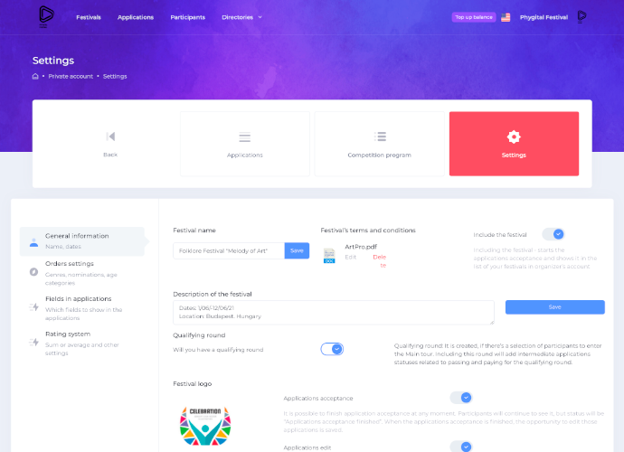 Create festival, competition or tournament. Set up application fields, competition program in just a few clicks.
