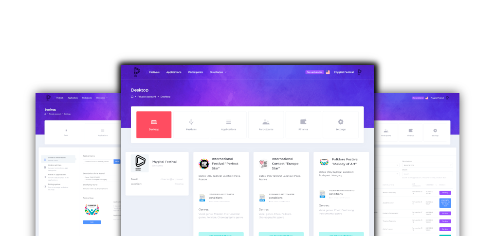 Participants will create convenient accounts, which will allow them to create and edit an application, keep all the information about taking part in festivals: certificates, score, the jury’s commentary